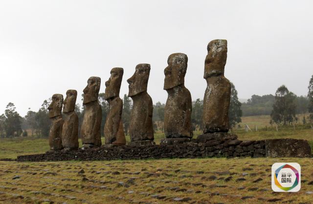 復活節島上的巨人石像排成一列。(新華社記者葉書宏攝)