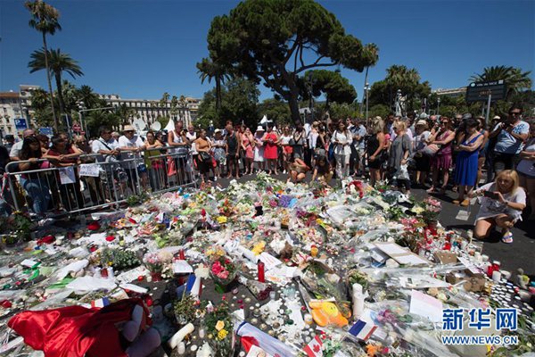 7月16日,在法國南部城市尼斯,人們聚集在恐怖襲擊發生地英國人漫步大道悼念遇難者。新華社記者 徐金泉 攝