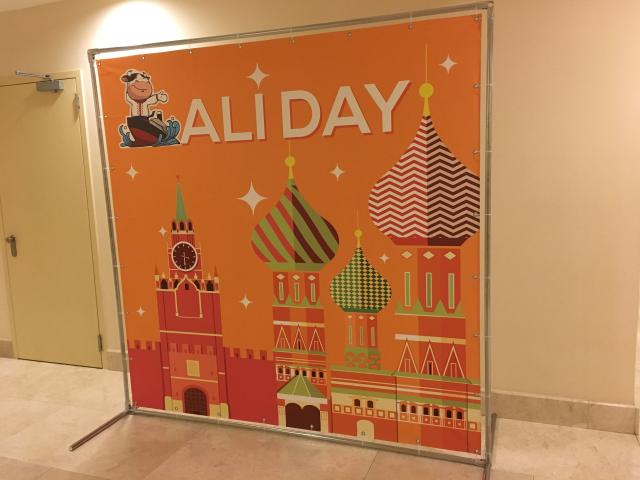 一進門,記者就看到一面紅框照片墻,馬云和普京在圣彼得堡經(jīng)濟論壇上的合影非常醒目。在明亮的落地窗前,“雙十一”的紅色標(biāo)志讓記者恍惚回到了中國。