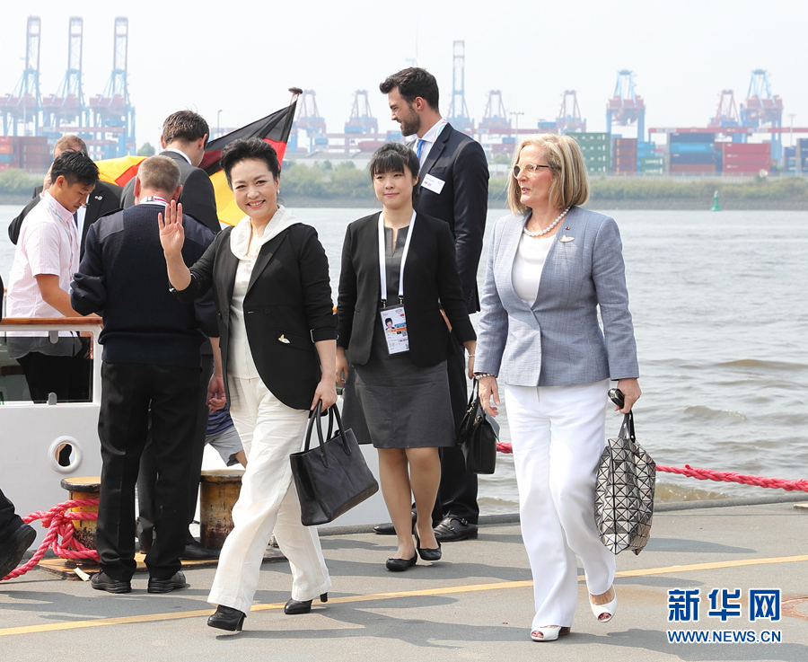 當地時間7月7日上午,應德國總理默克爾丈夫紹爾邀請,國家主席習近平夫人彭麗媛同出席二十國集團領導人第十二次峰會的部分代表團團長配偶乘船參觀漢堡港。新華社記者 王曄 攝