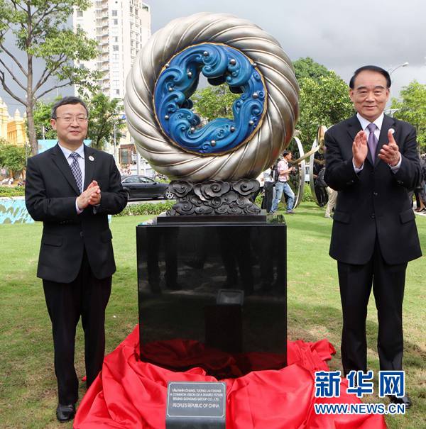 11月9日,在越南峴港APEC公園,中國外交部副部長李保東(右)、商務(wù)部副部長王受文(左)共同為中國贈送的雕塑作品《和夢同圓》揭幕。作為2017年亞太經(jīng)合組織(APEC)領(lǐng)導(dǎo)人會議周的一部分,越南峴港APEC公園9日正式開放,展示21個成員經(jīng)濟體藝術(shù)家創(chuàng)作的雕塑。新華社記者李鵬攝