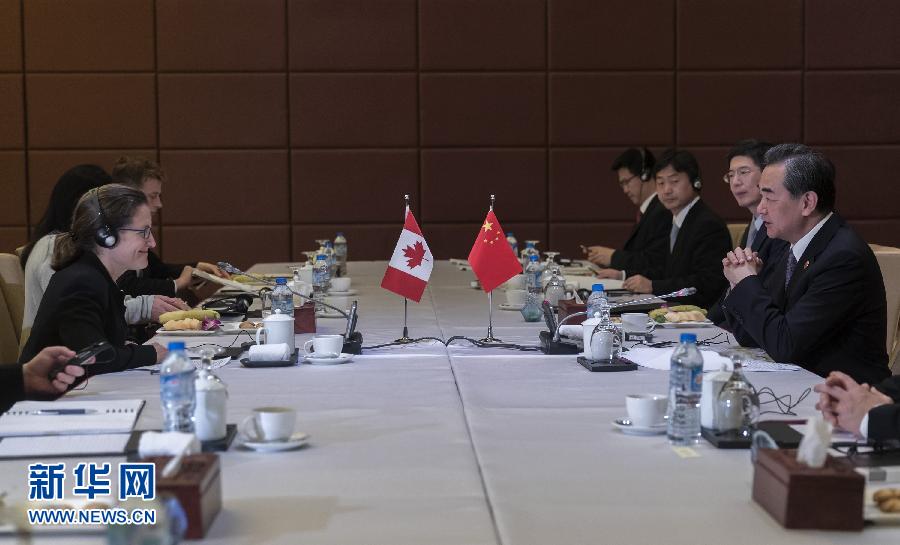 11月11日,外交部長王毅在越南峴港應約會見加拿大外長弗里蘭。新華社記者 費茂華 攝