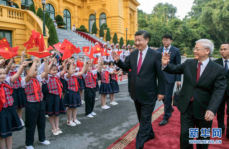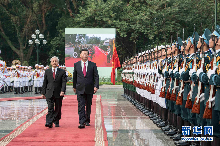 11月12日,中共中央總書記、國家主席習近平在河內越共中央駐地同越共中央總書記阮富仲舉行會談。這是會談前,阮富仲在主席府廣場為習近平舉行盛大歡迎儀式。 新華社記者 李濤 攝