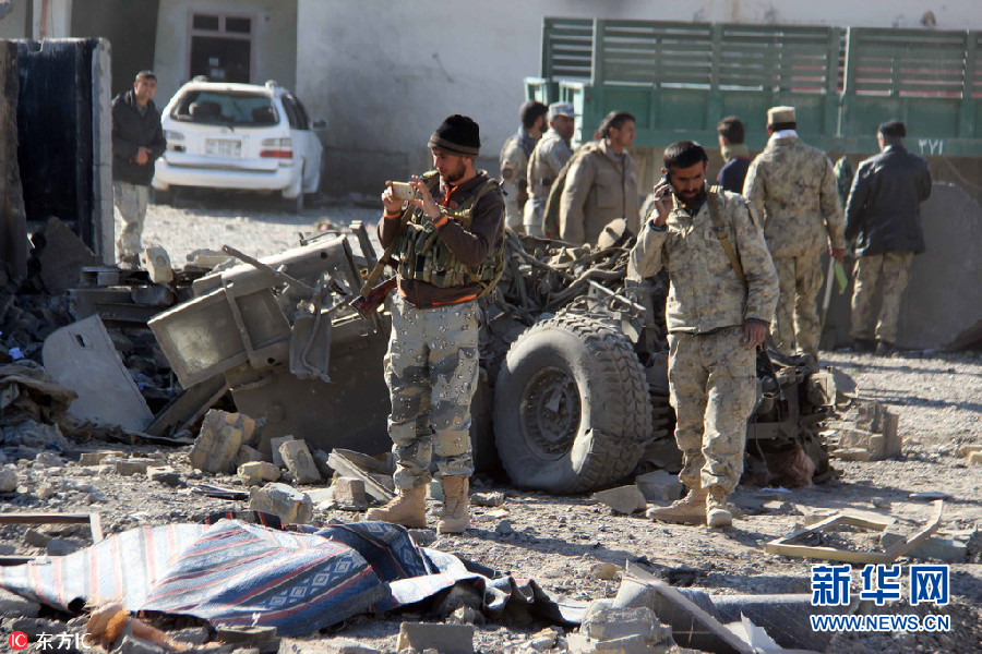 當地時間22日,阿富汗坎大哈,當地一處警察總部遭遇自殺式汽車炸彈襲擊,造成至少6名警察死亡,4人受傷。圖為阿富汗安全官員檢查現場。(圖片來源:東方IC)