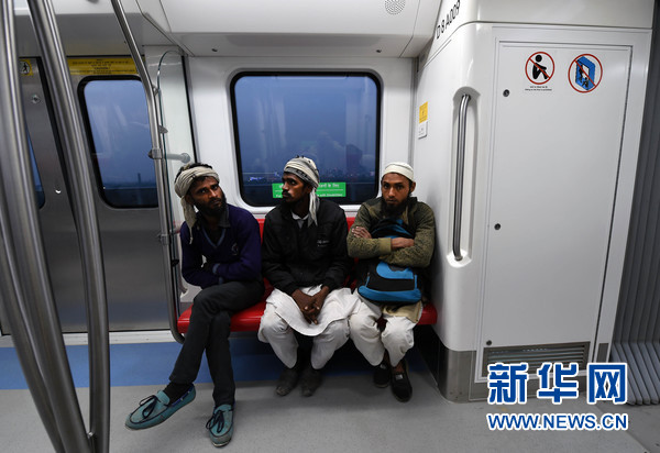 12月25日,在印度首都新德里洋紅色地鐵線,三名男子在乘車。當日,連接新德里及其衛星城諾伊達(Noida)之間的洋紅色地鐵線建成通車。這條線路全長12.64公里。德里地鐵公司計劃未來提高這條地鐵線路自動化水平,以“無人值守模式”運行。目前,新德里運營地鐵線路共有7條,分別用顏色命名,包括紅色、黃色、藍色、綠色、橙色、紫羅蘭和洋紅色。新華網發 (張迺杰 攝)
