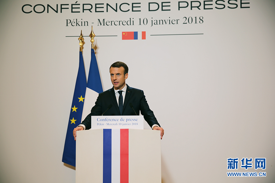 1月10日,法國總統馬克龍在北京舉行的新聞發布會上回答記者提問。新華網 吳傲雪 攝