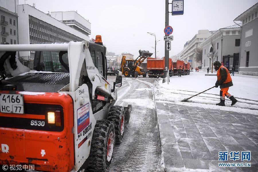 當地時間1月20日,俄羅斯莫斯科,工作人員在清理街道上的積雪。 (圖片來源:視覺中國)