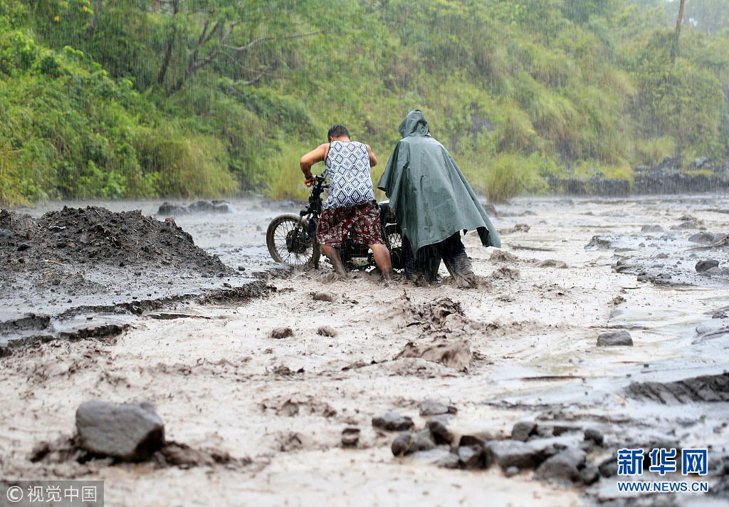 當地時間2018年1月27日,菲律賓阿爾拜省,民眾穿過混合著火山灰的泥漿河。(圖片來源:視覺中國)