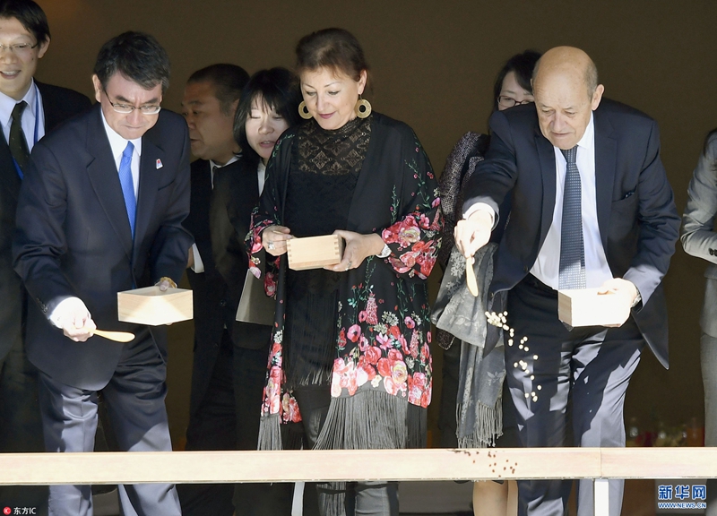當地時間2018年1月27日,日本東京,日本外相河野太郎接待到訪的法國外長讓·伊夫·勒德里昂及其夫人,帶其參觀赤坂宮,體驗喂魚。(圖片來源:東方ic)