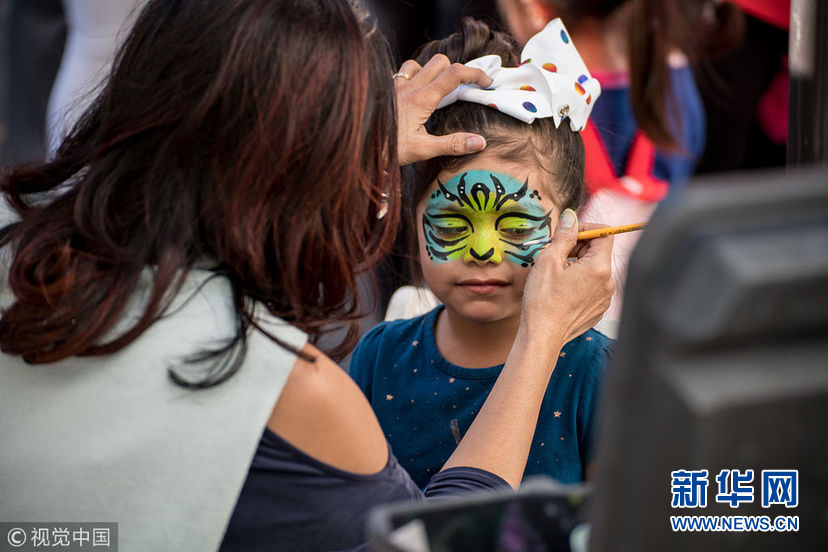 當地時間1月28日,美國洛杉磯,當地Grove商場舉行少林武術表演以及其他中國文化類的演出,慶祝傳統新年,場外攤位還有傳統剪紙,捏面人,糖畫,彩繪等項目。圖為彩繪。(圖片來源:視覺中國)