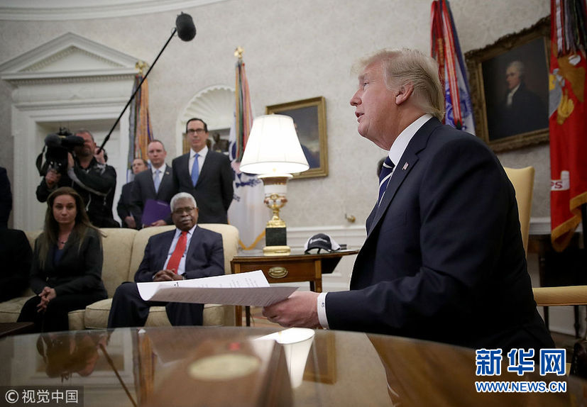 當地時間1月31日,美國華盛頓,美國總統特朗普在白宮與公司雇員討論稅收改革問題。(圖片來源:視覺中國)