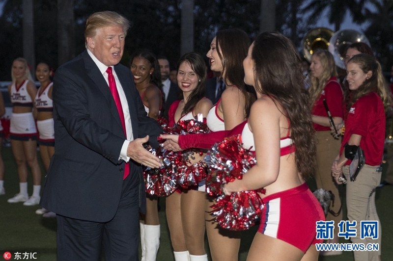 當地時間2018年2月4日,美國佛州西棕櫚灘,美國總統特朗普與第一夫人梅拉尼婭在高爾夫俱樂部觀看大學生樂隊的歡迎演出,與美女啦啦隊員握手。據悉,特朗普夫婦出席在該俱樂部舉辦的超級碗派對。(圖片來源:東方IC)