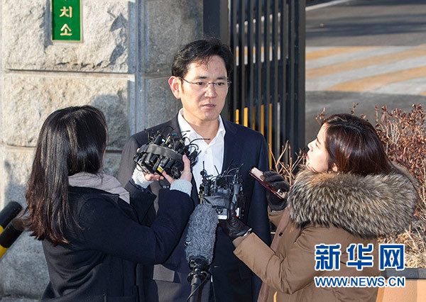 2月5日,韓國三星電子副會長李在镕(中)在位于韓國儀旺市的拘留所外接受記者采訪。新華社發(李相浩 攝)