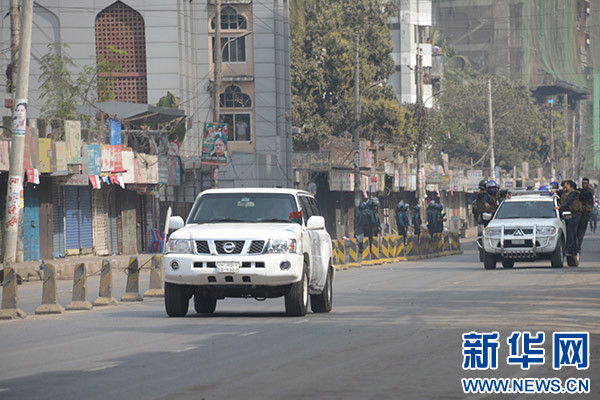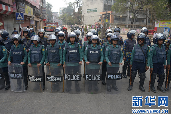 2月8日,在孟加拉國首都達卡,警察在街頭警戒。新華社發(薩利姆·禮薩 攝)