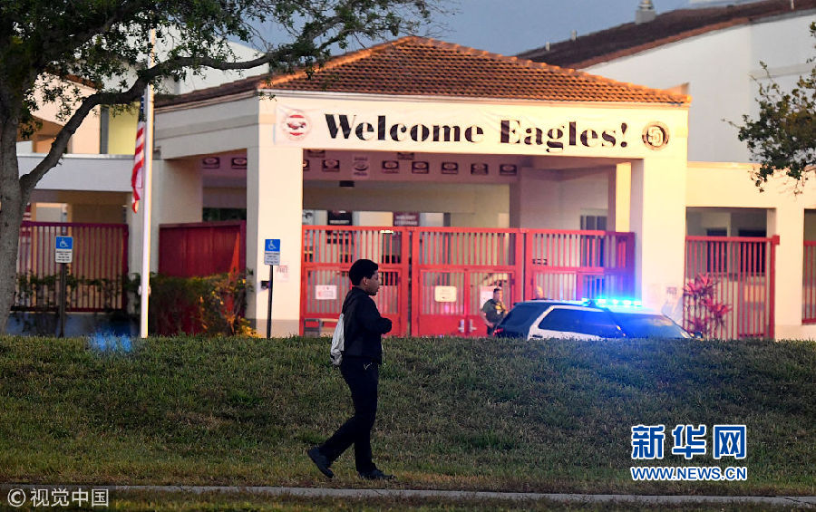 當?shù)貢r間2月28日,美國佛羅里達州帕克蘭,發(fā)生槍擊案的道格拉斯中學復課,學生和教職工重返校園,大批警察出動維護治安。2月14日,一名19歲的槍手在學校里開槍,造成17人死亡。(圖片來源:視覺中國)
