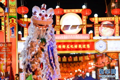 2013年馬來西亞元宵節,馬六甲武術龍獅總表演舞龍舞獅,大鬧元宵。新華社發 張紋綜攝