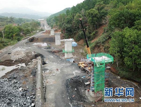 這是3月27日在老撾南塔省航拍的正在施工中的橋梁。新華網發 劉艾倫攝