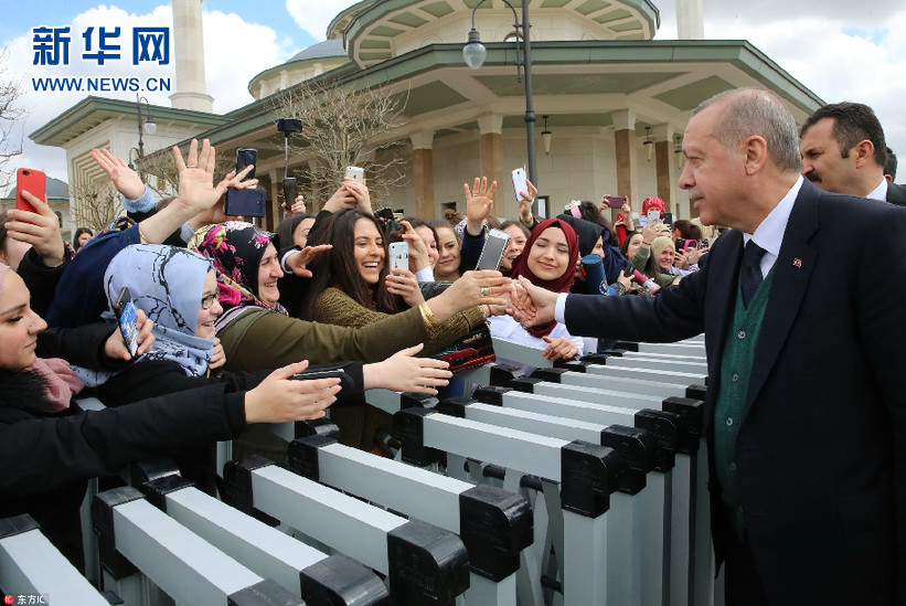 當(dāng)?shù)貢r(shí)間3月30日,土耳其安卡拉,土耳其總統(tǒng)埃爾多安在星期五禮拜結(jié)束后與民眾打招呼。(圖片來源:東方IC)