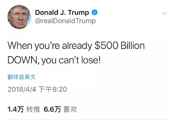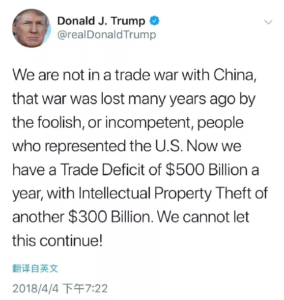 “我們沒有和中國打貿易戰,這場戰爭多年前就被當時代表美國的那些愚蠢無能的人打輸了?,F在我們一年有5000億美元的貿易逆差,另有3000億美元知識產權被竊。我們不能讓這一切繼續!”