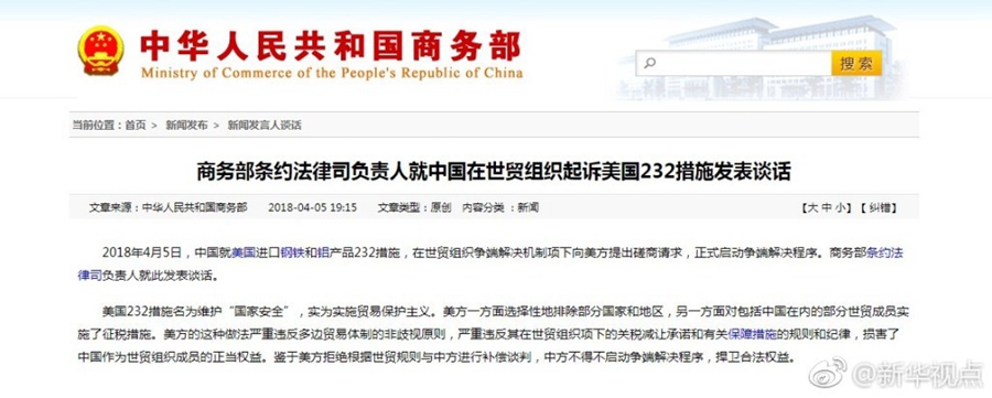 2018年4月5日,中國就美國進口鋼鐵和鋁產品232措施,在世貿組織爭端解決機制項下向美方提出磋商請求,正式啟動爭端解決程序。商務部條約法律司負責人就此發表談話。