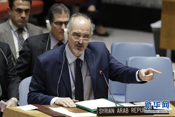 資料圖:2月24日,在位于紐約的聯(lián)合國(guó)總部,敘利亞常駐聯(lián)合國(guó)代表賈法里(前)在安理會(huì)通過(guò)敘利亞全境停火決議草案后發(fā)言。新華網(wǎng)記者 李木子 攝