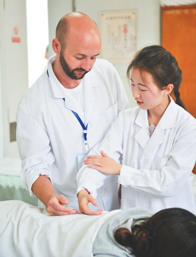 2017年7月,11名西班牙“洋中醫(yī)”來(lái)到位于昆明市的云南省中醫(yī)院學(xué)習(xí)推拿和針灸。圖為中國(guó)老師指導(dǎo)“洋中醫(yī)”。人民視覺(jué)