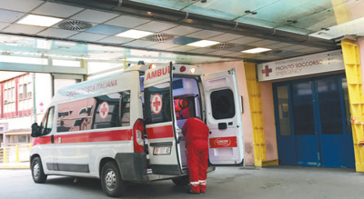 意大利羅馬一家大型綜合醫(yī)院,這里頻繁有救護(hù)車抵達(dá)運(yùn)送病人。圖為其中一輛剛剛運(yùn)送病人抵達(dá)急診室的急救車。記者 韓碩 攝
