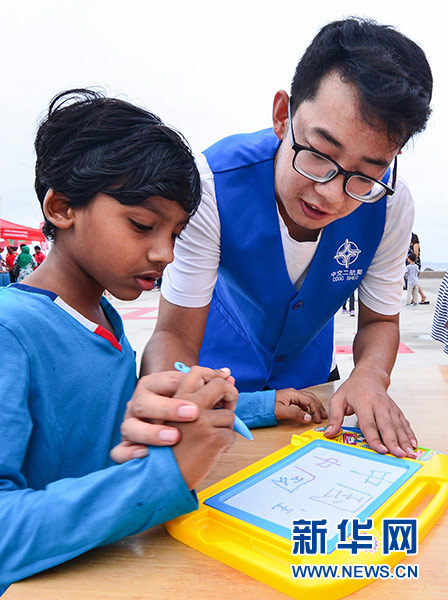 5月4日,在馬爾代夫首都馬累市中心停機(jī)坪廣場,中國志愿者教當(dāng)?shù)貎和瘜憹h字。新華社發(fā)(杜才良 攝)