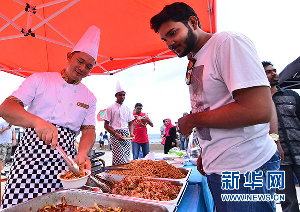 5月4日,在馬爾代夫首都馬累市中心停機(jī)坪廣場,一名當(dāng)?shù)啬凶樱ㄓ遥┢穱L中國美食。 新華社發(fā)(杜才良 攝)