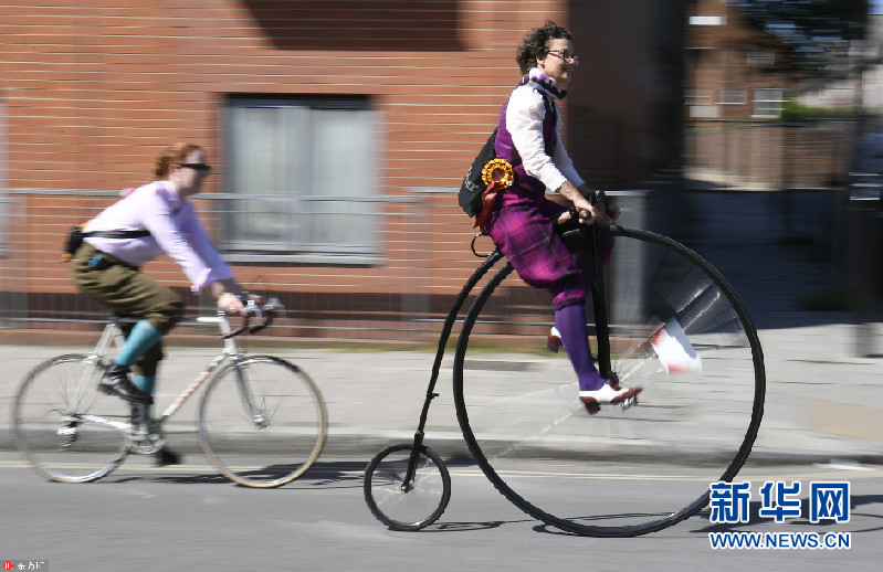 當地時間2018年5月5日,英國倫敦,當地舉辦復古騎行活動,民眾身穿花呢子服裝騎車穿行在倫敦街頭。今年是該活動舉辦十周年。(圖片來源:東方IC)