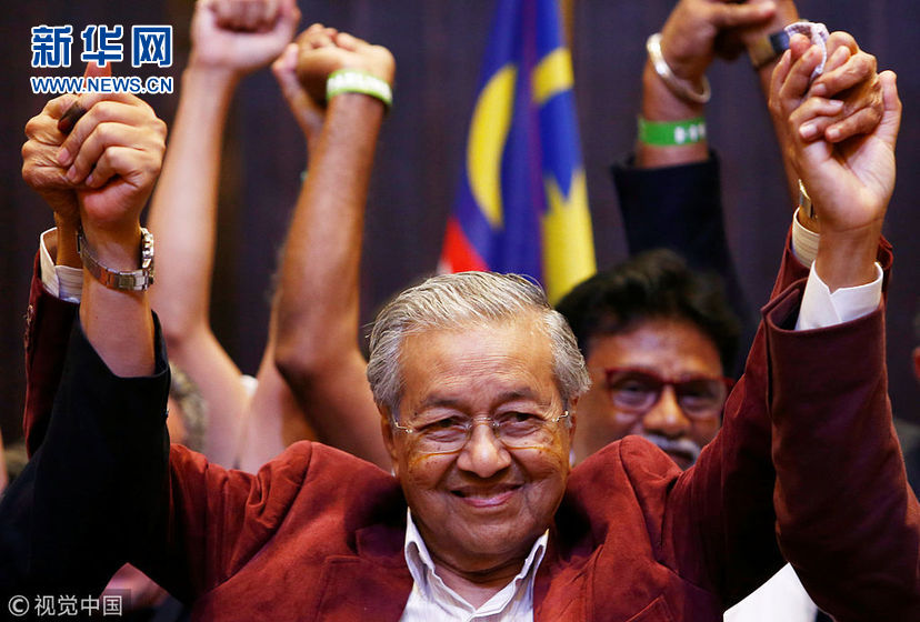 當(dāng)?shù)貢r(shí)間2018年5月9日,馬來西亞吉隆坡,馬哈蒂爾代表希望聯(lián)盟召開新聞發(fā)布會。9日,馬來西亞國會大選結(jié)束。10日凌晨官方點(diǎn)票結(jié)果顯示,前總理馬哈蒂爾(Mahathir)帶領(lǐng)的希望聯(lián)盟取得112席簡單多數(shù)國會議席,足以籌組政府及勝出大選,并終結(jié)執(zhí)政國民陣線長達(dá)60年的管治。現(xiàn)總理納吉布領(lǐng)導(dǎo)的國民陣線僅獲得76席。(圖片來源:視覺中國)