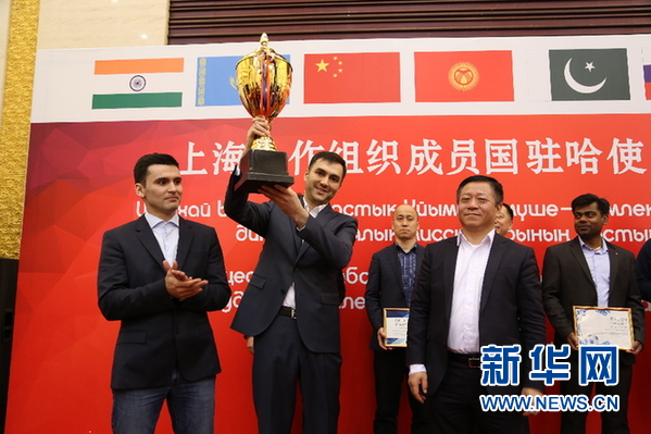 ? 中國駐哈薩克斯坦大使張漢暉(前排右一)為冠軍獲得者塔吉克斯坦隊頒發(fā)獎杯。 新華網(wǎng)發(fā) 阿比洛夫攝