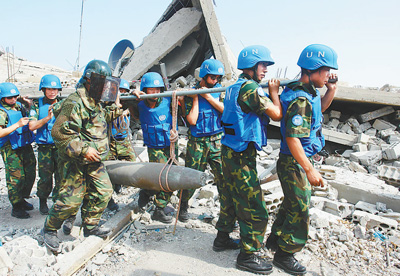 中國維和部隊官兵在黎巴嫩南部轉移未爆航彈。資料照片(新華社發)