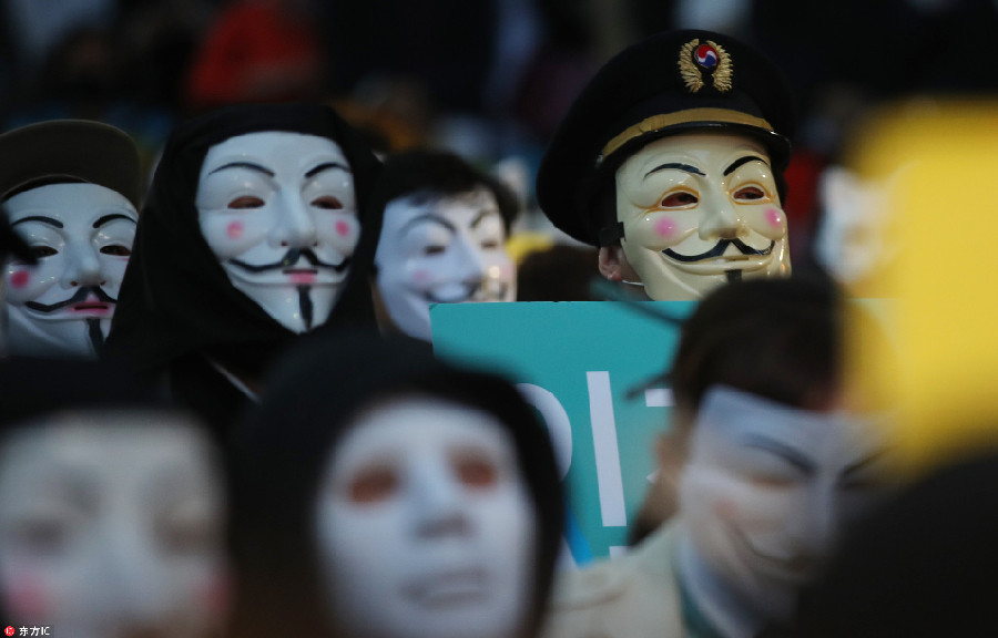 當地時間2018年5月18日,韓國首爾,大韓航空有限公司的飛行員戴著蓋伊·福克斯面具,在首爾市區集會抗議,反對大韓航空會長兼首席執行官趙亮鎬及其家庭。