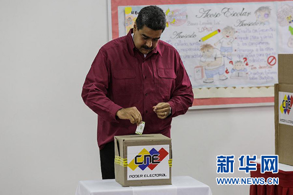 5月20日,委內瑞拉總統馬杜羅在加拉加斯的一處投票點投票。 委內瑞拉20日舉行總統選舉投票,選舉結果預計當晚揭曉。新華社發(鮑里斯攝)