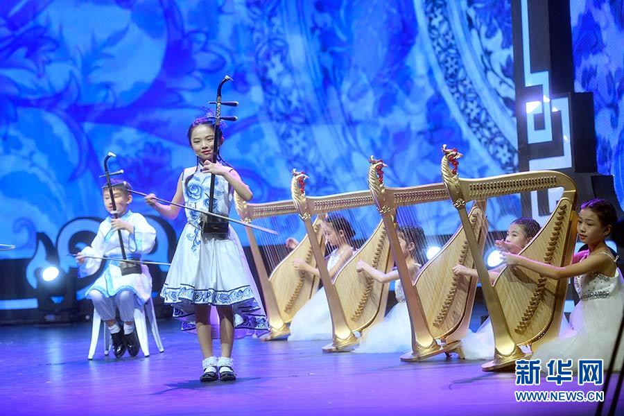 2017年8月22日,來自中國的青少年在北京舉行的2017年上合組織成員國青少年藝術展演上表演民樂合奏《國風》。新華社記者 金良快 攝