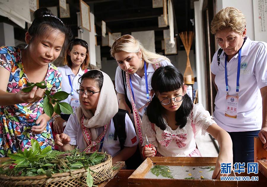 2017年8月15日,“魅力非遺——第二屆上海合作組織夏令營·非物質文化遺產交流體驗”活動在貴州省黔東南苗族侗族自治州丹寨縣萬達小鎮(zhèn)舉行。這是外國手工藝人在古法造紙體驗館了解花草紙的制作過程。新華社發(fā)(黃曉海 攝)