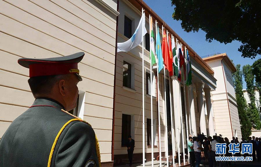 2017年6月15日,上合組織新成員印度、巴基斯坦兩國國旗,首次在設在北京的上合組織秘書處迎風飄揚。