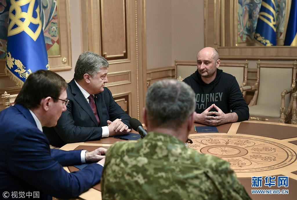 5月30日,烏克蘭基輔,烏克蘭總統波羅申科會見此前被報道“死亡”的俄羅斯記者巴布琴科。(圖片來源:視覺中國)