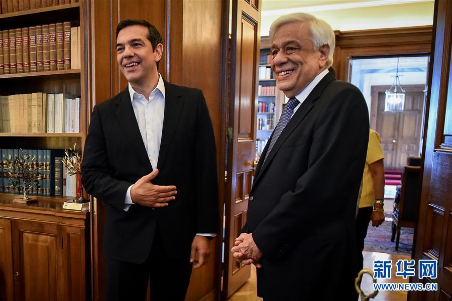 6月12日,在希臘雅典,希臘總理齊普拉斯(左)向希臘總統帕夫洛普洛斯通報他與扎埃夫的通話情況。新華社發(馬里奧斯·羅洛斯攝)
