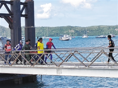 7月6日,泰國普吉島查龍碼頭,打撈船換成軍艦,船只無法靠岸更換碼頭,警察撤離該碼頭。 通訊員 卜志輝 攝