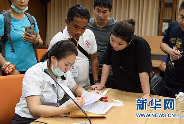 7月9日,在泰國普吉島的哇集拉醫院,來自普吉國際醫院的志愿者(前左)在幫助遇難者家屬做確認遺體登記工作。新華社記者 秦晴 攝