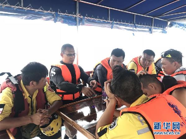 7月8日,在泰國普吉,來自民間的公羊救援隊與普吉藍海救援隊成員制定救援方案。新華社發(普吉藍海救援隊提供)