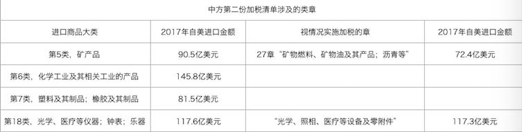 第二份清單,是從美進口的化工品、醫(yī)療設(shè)備、能源產(chǎn)品(包括煤炭、原油、成品油、液化石油氣等)等商品,2017年,中國自美國進口金額約160億美元。第二份清單是否執(zhí)行、生效時間將視美方行動另行宣布。