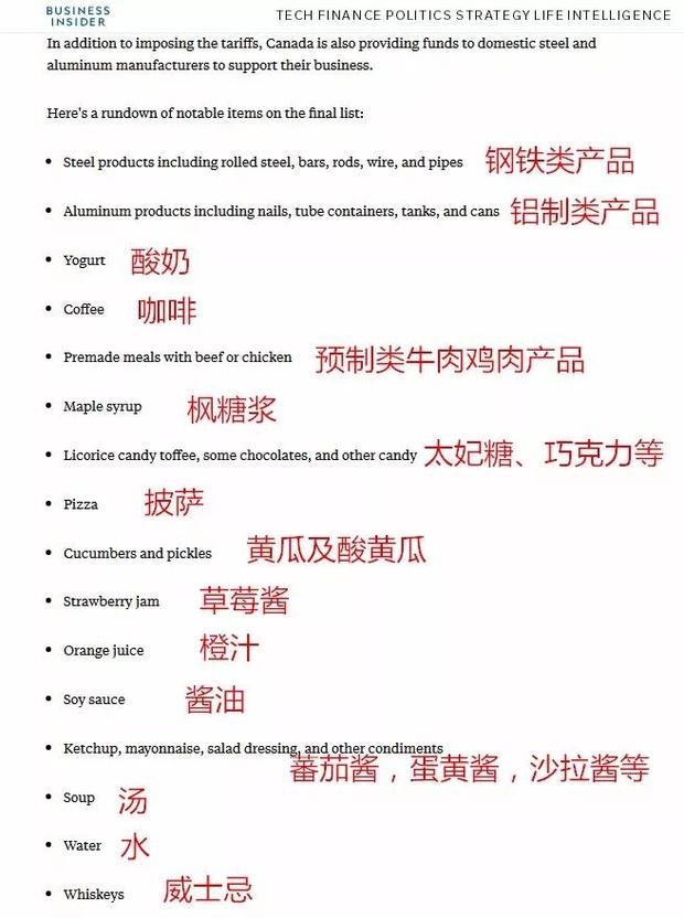 美國網站Business Insider貼心做了個大致梳理,不難看出,這份后續打擊清單,正如加拿大廣播公司評論所說,乍看上去簡直像是家庭主婦去超市的購物單:從比薩餅到草莓醬,從威士忌到酸黃瓜,跟第一輪打擊的鋼鋁顯得實在不匹配。