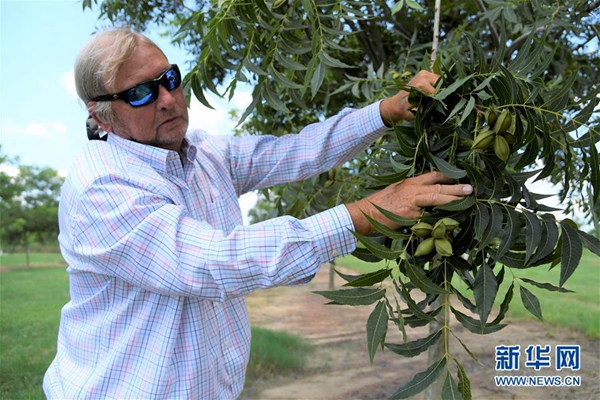 7月10日,在美國佐治亞州奧西拉,山核桃種植戶蘭迪·哈德遜在自己的種植園中展示未成熟的山核桃。 新華社記者楊承霖攝