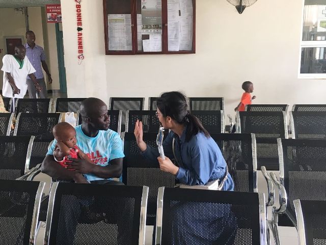 2018年7月18日,中國(guó)援建塞內(nèi)加爾兒童醫(yī)院候診室,蘇利曼·費(fèi)迪奧爾抱著孩子接受記者采訪。(新華社記者蔣國(guó)鵬攝)