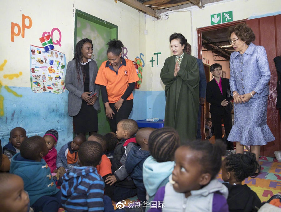 當(dāng)?shù)貢r(shí)間7月24日上午,國(guó)家主席習(xí)近平夫人、聯(lián)合國(guó)教科文組織促進(jìn)女童和婦女教育特使彭麗媛在南非總統(tǒng)夫人莫采佩陪同下,參觀位于比勒陀利亞東郊的烏坦多社區(qū)托兒所。 新華社記者 王曄 攝
