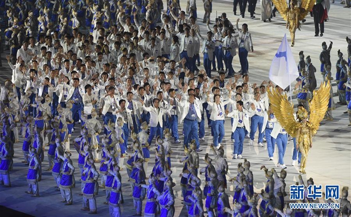 新華社雅加達8月18日電(記者 陸睿)第18屆亞運會當(dāng)?shù)貢r間18日晚7時在雅加達朋加諾體育場揭開帷幕。繼今年2月韓國平昌冬奧會開幕式之后,朝鮮和韓國體育代表團再次攜手在國際體育盛會共同入場,引發(fā)現(xiàn)場觀眾歡呼。