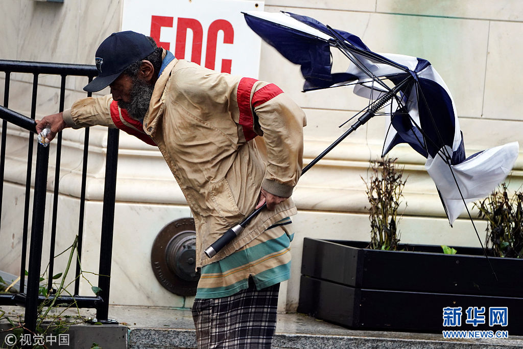 當?shù)貢r間2018年9月15日,美國北卡羅來納州,颶風“佛羅倫薩”在美國北卡羅來納州登陸,一名當?shù)啬凶泳o握欄桿抵御狂風。(圖片來源:視覺中國)